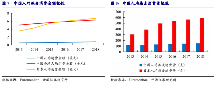 中国燕麦行业人均消费量、消费金额均较低,行业量价提升空间大。目前中国的燕麦行业人均消费量和消费金额均较低: