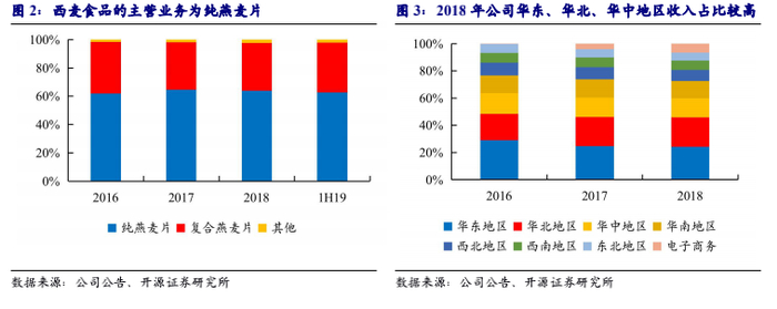 多年专注于燕麦行业,目前已基本在全国布局。公司一直专注于燕麦主业,主要产品为纯燕麦片和复合燕麦片,燕麦产品占西麦食品营业收入比例,一直维持在97%以上。具体分产品来看,2019H1纯燕麦片占比高达62.7%,为公司的主要业务。分地区来看,西麦食品已是全国布局,2018年华东、华北、华中地区占比分别为24.1%、21.8%和13.9%,华东、华北营业收入占比较高。