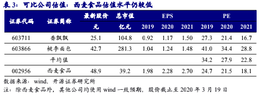 市场对于食品饮料行业通常采用相对估值方法。我们对比主要冲调企业香飘飘和定位于主食的烘焙企业桃李面包的估值水平,可发现2020年香飘飘和桃李面包的估值水平分别为21.4、34.4,而西麦食品估值约21.5倍PE,略高于香飘飘,低于桃李面包。