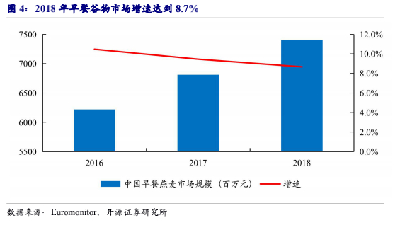 早餐燕麦行业近年增速较快。燕麦行业最早是在20世纪60年代初出现在中国,于21世纪初快速成长,2016年中国谷物磨制业市场规模增5.8%至1.4万亿元,而早餐燕麦市场增10.5%至62亿元,早餐燕麦市场增速快于谷物市场。随着消费者对便捷、健康食品需求增长,燕麦行业一直保持较快增速,2018年早餐燕麦市场规模增长8.7%至74亿元,2013-2018年早餐燕麦市场的收入年复合增长率高达10.14%。