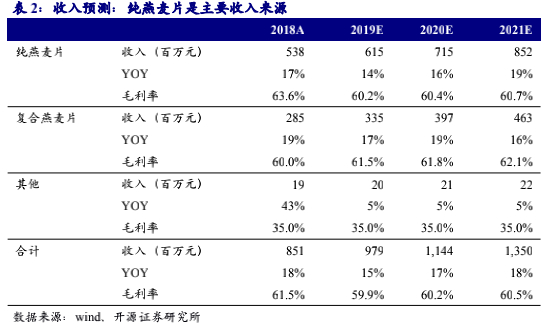 我们认为2020年随着产能逐渐释放,纯燕麦片仍为主要收入来源,预计将有16%左右增长;2019年公司开始做复合燕麦片的铺垫工作,预计2020年将逐渐显效,复合燕麦片预计增19%。我们预计2019-2021年公司营收分别增长15%、17%、18%。