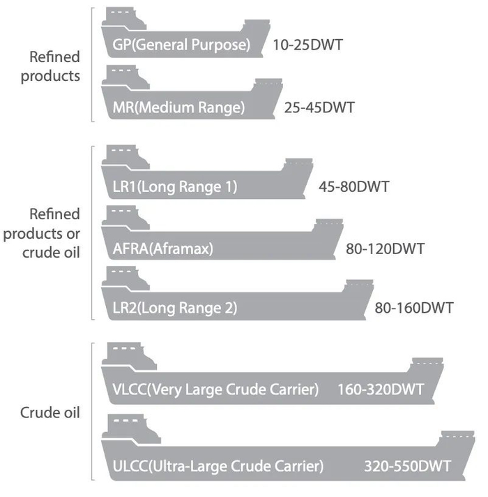 A:基于AFRA(运费费率平均运价)评估标准,油轮按载重吨位可分为小型轮General Purpose(1-2.5万吨)、中型轮Medium Range(2.5-4.5万吨)、LR1型轮(4.5-8万吨)、LR2型轮(8-16万吨)、超大型轮VLCC(16-32万吨)、巨型轮ULCC(大于32万吨)。