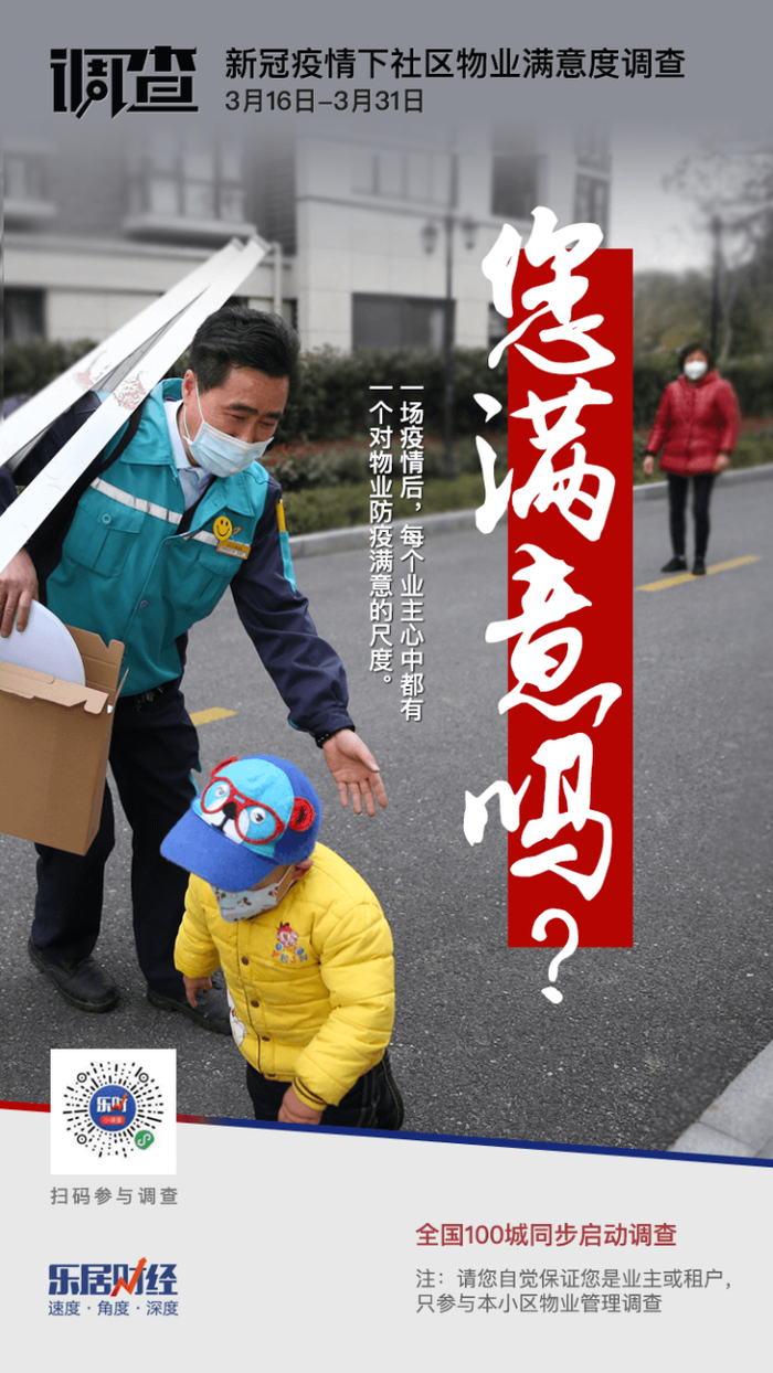如果您是业主或者租户,请您一起参加到这次《2020中国100城物业防疫业主满意度大调查》中来,一人一票。另外,记得邀请邻居参与,本次调查一个社区超十位业主或租户参与,调查才视为有效。具体请扫图二维码: