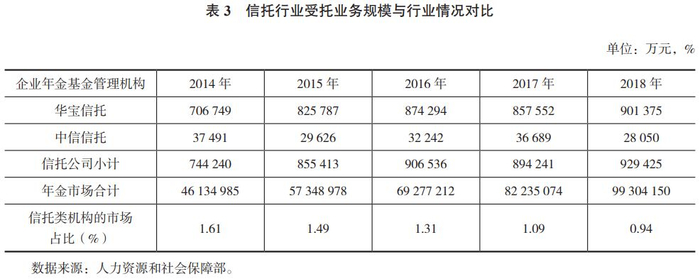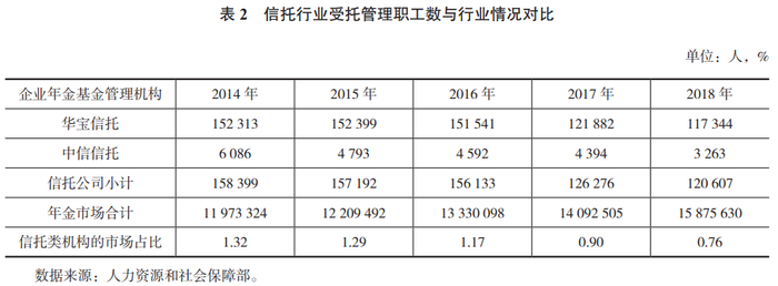 目前,信托行业仅有2家信托公司拥有企业年金管理人资格,其中华宝信托拥有企业年金受托人、账户管理人资格,中信信托拥有企业年金受托人资格。两家信托公司共管理256家企业、超过12万人的企业年金,管理规模约为93亿元,受托企业数、职工数和管理规模三项指标的市场占比分别为0.39%、0.76%、0.94%。