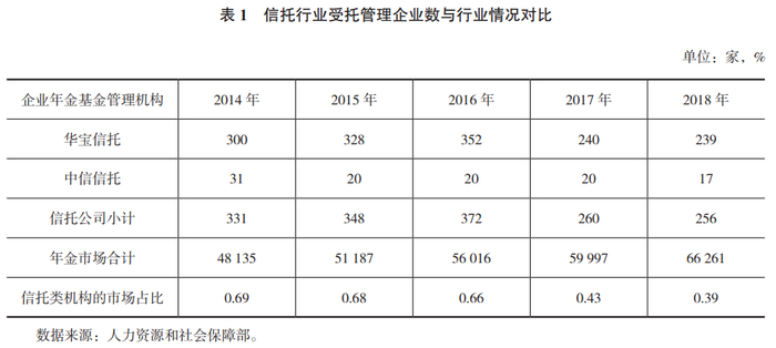 整体来看,近五年信托公司在企业年金业务方面参与度不高,受托企业数、职工数和管理规模在整个企业年金业务市场中的市场份额逐年下降,截至2018年底,三项指标的市场占比均不足1%。