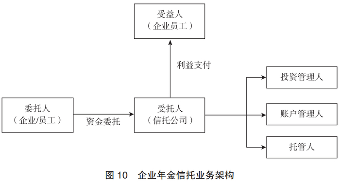 (2)企业年金信托。企业年金作为我国养老保障体系的第二支柱,在业务模式、资金来源、领域投向、运营管理、交易架构和风控措施等方面均须依据年金相关规定运作。我国企业年金业务的开展始于2004年5月1日《企业年金试行办法》的施行。