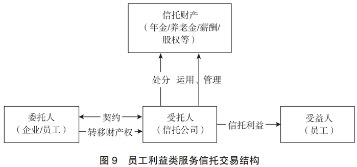 针对境内已开展的员工利益类服务信托的情况,目前主要包括养老金信托、企业年金信托和员工持股/激励信托三种类型。养老金信托指信托机构作为受托人,接受企业员工定期缴纳的养老基金,提供各项信托服务,在雇员退休后定期向其支付退休金的一类信托服务业务。养老金信托是以养老金制度的建立为基础设立的。企业年金信托是指信托机构作为受托人,接受企业员工及企业定期缴纳的企业年金和职业年金,提供各项信托服务,根据相关管理办法在特定的触发条件下,向其支付的一类信托服务业务。企业年金信托是以企业相关年金制度的建立为基础设立的。员工持股/激励信托是企业员工通过各种方式获得本企业股份,或者是企业将其员工激励股权直接委托给信托机构,企业通过结构化设计委托信托机构通过定增或二级市场方式获取部分的企业股权,通过财产权信托、结构化信托等方式,使满足条件的企业员工获得股权激励,并参与企业经营管理,进而提高员工的积极性及企业活力。