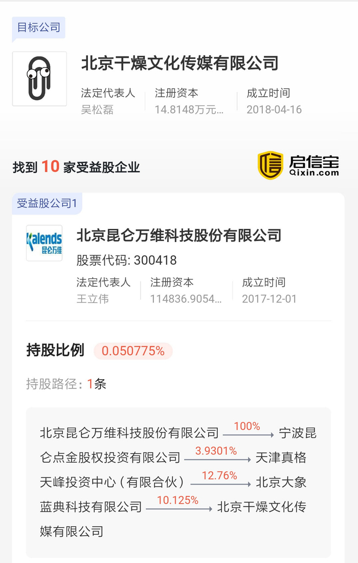 启信宝受益股功能显示,回形针背后的上市公司多达10家,其中包括北京昆仑万维科技股份有限公司、百隆东方股份有限公司、华闻传媒投资集团股份有限公司、紫光股份有限公司、完美世界股份有限公司等。