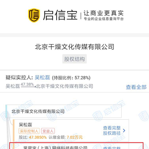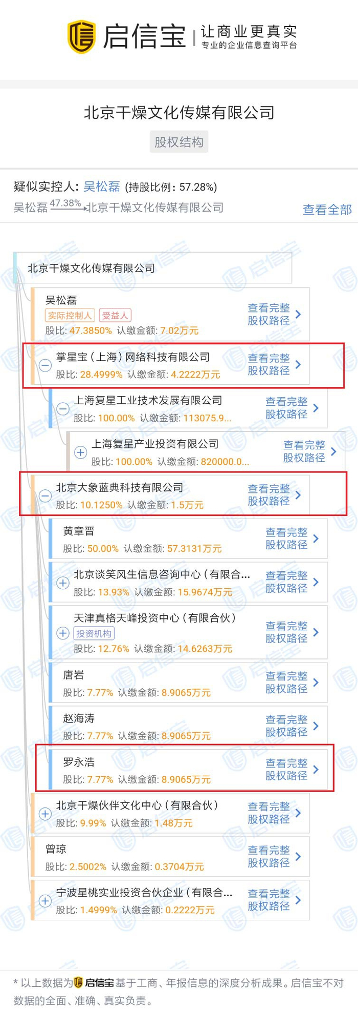 其股权结构显示,吴松磊为第一大股东;复星集团旗下掌星宝(上海)网络科技有限公司持股28.4999%,为第二大股东;第三大股东则是北京大象蓝典科技有限公司,持股10.125%,罗永浩为北京大象蓝典科技的股东之一,持股7.77%。