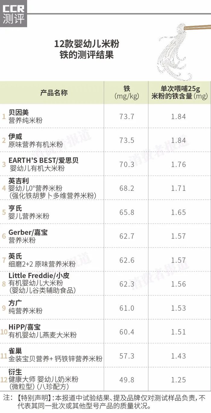 检测结果显示,贝因美、伊威、EARTH'S BEST/爱思贝铁含量较高,均超过70mg/kg;雀巢和衍生较低,铁含量为57.3mg/kg和49.8mg/kg。