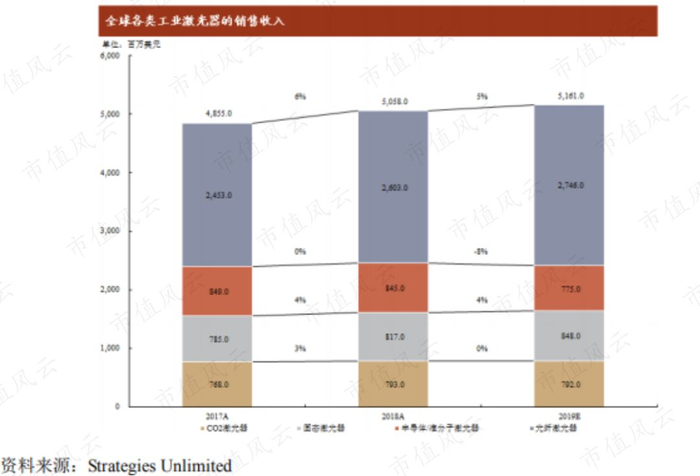 根据Strategies Unlimited统计,2018年全球各类工业激光器销售收入50.58亿美元,同比增长4%。2019年预计收入51.61亿美元,其中贡献最大的是光纤激光器(增益介质是玻璃光纤的激光器),预计收入达到27.46亿美元。