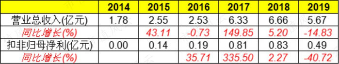 根据公司业绩预告披露,2019年,公司营业收入5.67亿元,同比下降15%;扣非归母净利0.49亿元,同比下降41%。