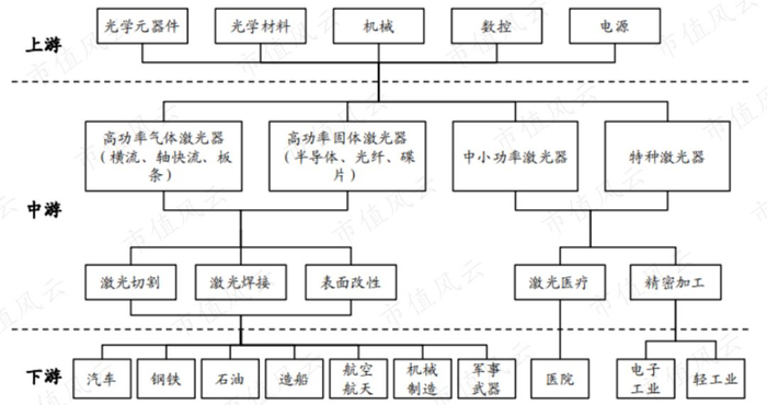 再来看看激光产业链。上游主要包括激光材料及配套元器件,中游为激光器制造,下游则以激光装备、应用产品、消费产品为主。总的来说,我国初步形成了较成熟的激光产业链。