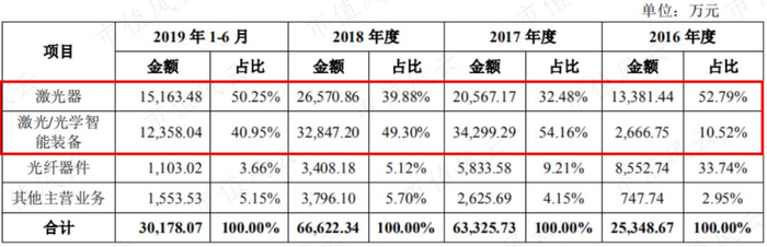 随着公司转移经营重点、收缩光纤器件业务,杰普特光纤器件销售额从2016年的8552万元减少到2019年上半年的1103万元,从贡献三分之一的营业收入到占比不足4%。