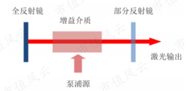 泵浦源为激光器提供光源,增益介质(也称工作物质)吸收泵浦源提供的能量后将光放大,谐振腔为泵浦光源与增益介质之间的回路,振腔振荡选模输出激光。