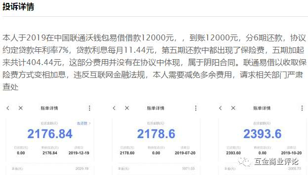 2019年12月16日,李先生在聚投诉发帖称,其在中国联通沃钱包“易借”借款12000元,分6期还款,协议约定贷款年利率7%,贷款利息每月11.44元,前五期还款中出现了保险费,五期加起来共404.44元,这部分费用并没有在协议中体现,属于阴阳合同。联通易贷以收保险费名义变相加息,本人需要见面多余费用,请求相关部门严肃查处。