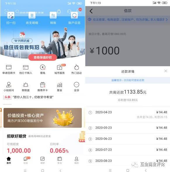 在此之前,互金商业评论小编曾尝试在招商银行APP申请借钱,其中“闪电贷”产品最高可借30万,年利率低至7.2%,小编尝试申请但未通过。虽然小编申请“闪电贷”失败,但页面提示小编有1000元“好期贷”额度。进入提款页面发现,借款1000元,分12期,每期偿还94.48元(本金74.33元+利息20.15元)。