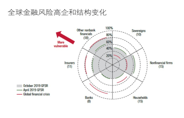 距2008年的全球金融危机已经10多年了,相比2008年,今天全球金融综合风险已经接近甚至超过了2008年,风险结构发生巨大的改变。我们用国际货币基金组织发布的全球金融风险图看,红色曲线代表2008年全球金融危机时的金融风险水平,灰色的阴影代表2019年10月时的全球金融风险水平。我们可以看到,银行业的金融风险下降,大大低于2008年的水平,保险业的金融风险较2008年水平也有下降,居民部门的债务风险较2008年水平也有所下降。但是,由于政府大规模发债,今天主权金融债务风险已经超过了2008年水平。低利率环境推升了企业债务急剧攀升。同时因为经济增长疲软,企业偿债能力在弱化,约30%的公司的偿债能力低于警戒线的ICR(利息覆盖率)=3 的标准,企业偿债能力在弱化。企业金融债务风险已经高于2008年水平。非银行金融机构来在低利率环境下,为达到目标收益而增加风险资产的头寸并加大杠杆率,非银行金融机构的金融风险已经和2008年相平。特别在宏观经济金融风险方面,危机以后,政府实施量化宽松货币政策和财政政策救市和刺激经济增长,发债以支持金融市场和私人部门复苏,动用了大量的政策空间。比较2008年,发达国家央行的资产负债表普遍扩张了3-5倍, 政府债务负担上升了50%。新兴经济和发展中国家的央行资产负债表也扩张了50-80%,政府债务上升了30%。如果金融危机或经济危机再次发生,今天政府的公共政策空间已经很小了。因此,相比2008年,今天的宏观经济金融风险大大上升。整体看,尽管全球银行业、保险业和居民部门的金融脆弱性较2008年危机时期有所改善,但全球其他经济金融部门的脆弱性已经接近和超过2008年的水平了。也就说,整体看,目前全球金融风险水平已经达到了2008年危机时期的水平。(见图十三)