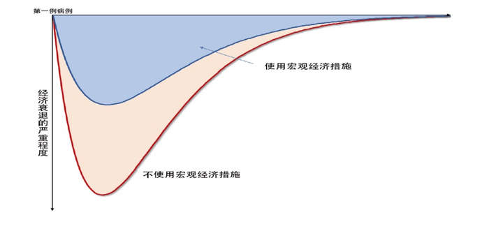 恢复疫情损伤的经济需要宏观经济政策刺激经济,如图五所示,宏观经济刺激政策可以平缓经济衰退政策,把迅速下跌的红色曲线上托到蓝色曲线,避免淡粉色面积所代表的可能的经济衰退损失。(见图五)