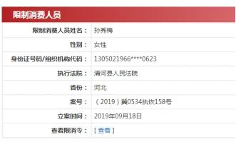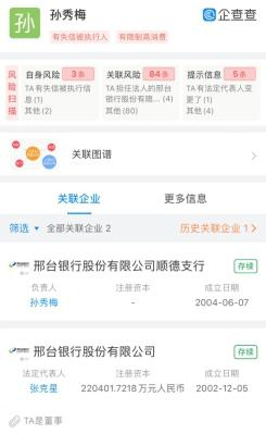 企查查显示,孙秀梅为邢台银行董事兼顺德支行负责人,其于2019年9月因违反财产报告制度被列为失信被执行人;同于2019年9月,孙秀梅收到限制高消费令,缘由为未按执行通知书指定的期间履行生效法律文书确定的给付义务,涉及与清河县鑫达来典当有限公司的借款合同纠纷。