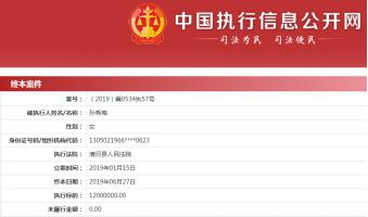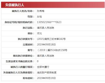 中国执行信息公开网上的信息与以上相符,同时另显示孙秀梅还存在一条被执行案件,立案时间为2019年1月15日,执行标的为1200万元。