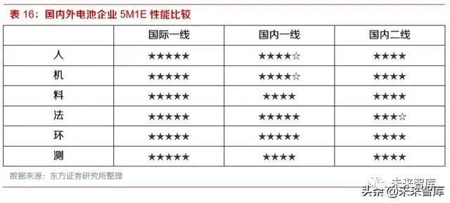 我们认为,在六大要素中,导致电池品质差异的因素主要是材料、技术和环境控制,企业基于各自 的偏好制定不同的竞争战略:国际一线电池企业力求做到全方位最优,因此电池品质最好,成本相 对较高;国内一线巨头追求成本与品质的平衡,选用的材料品质并非最优,但工艺和环境控制能力 出色,因此对内与竞争对手拉开质量差距,对外则具备性价比优势,目前在国内已占据绝对优势, 在海外市场竞争中也能不落下风;国内二线企业前几年过于追求性能参数,工艺能力相对较差,导 致被边缘化。