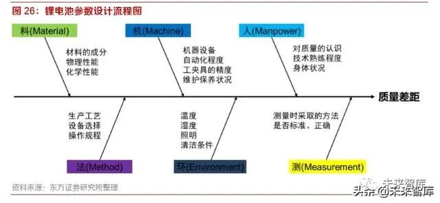 方法(Method):锂电池生产的工艺方法总体上相近,但是具体的工艺点都有特色,例如, 仅在制片环节,正极、负极浆料的配方、搅拌速度、添加剂种类和用量都有无数种组合,卷 绕时张力调节、烘干的温度和时间也各有差异,锂电池生产流程非线性耦合的特点决定了各 厂商在这上千个工艺点的区别是造成产品质量差异的主要原因。