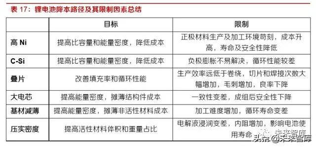 能量密度提升有如下路径,一是采用高比容量的活性材料,即正极高镍化和负极用硅碳材料;二是 优化工艺提高活性材料的重量占比,包括提升面密度、压实密度、卷绕改叠片、降低铜箔、铝箔、 隔膜等材料的厚度;三是提高电芯尺寸,挖掘规模效应。此外,在系统层面上还可以改进成组技术, 降低模组、PACK 等封装成本。