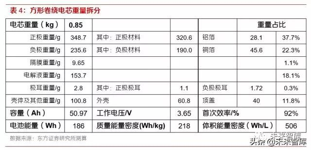 我们将最经典的 PHEV-2 型电芯规格代入其中,电芯的长度、宽度、厚度分别为 148mm、92mm、 27mm;计算得到该电芯的容量约 51Ah,质量能量密度为 216Wh/kg,体积能量密度为 512Wh/L, 与实际数字吻合度较好。电芯的各组成部分以及重量组成如下: