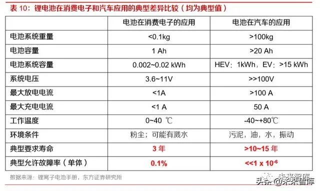 电动车的电池系统由数百个甚至数千个电芯连接而成,由于木桶效应,电池系统的性能取决于电池 包里性能最差的电芯。此外,与消费电子产品相比,电动汽车由于放电电流、工作电压以及工作环 境都更加严苛,动力电池允许的故障率较消费锂电池低 2-3 个数量级,因此质量要求更加苛刻。