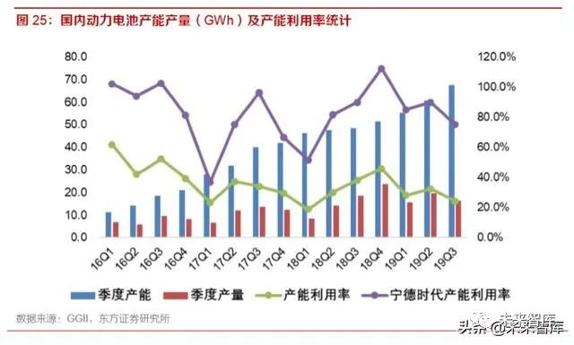 对于流程制造业,规模效应能够提高生产效率,降低生产成本。由于工序能力存在差异,车企倾向 于选择产品一致性更好的供应商,这导致一二线电池企业产能利用率的急剧分化。以 2019 年数据 为例,宁德时代全年出货量达33GWh,产能利用率约75%,其他企业的产能利用率多数徘徊在40% 以下,产能利用率的分化导致了成本差异的增加。2018 年宁德时代动力电池出货量达 23.5GWh, 其折旧总额约 20 亿元,国轩高科出货量 3.1GWh,折旧总额 3.33 亿元,这还不考虑宁德时代折旧 年限较国轩高科短一半。