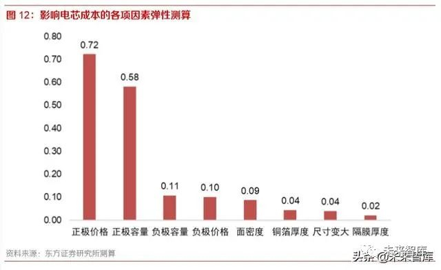 对成本模型中的主要参数进行敏感性分析,对成本影响最大的因素是正极材料的性能和价格,负极 性能和价格影响位居其次,但弹性系数已相差较远,此外,降低非活性材料的各项措施(提升活性 材料面密度、降低载体厚度、增大电芯尺寸等)尽管单项影响都不大,但累计起来降本效应也不容 小视。