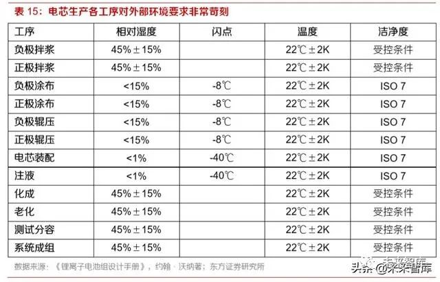 环境(Environment):锂电池生产对于环境的要求非常苛刻,主要是温度、湿度、颗粒物管 理等,温度方面,锂电池所有工序温度波动不超过 2℃;湿度方面的要求更为严格,涂布和辊 压过程要求湿度不高于 15%,电芯装配和注液过程需要湿度降至 1%以下,值得一提的是, 随着高镍材料的推广,电池生产对湿度的控制将进一步严苛,所有流程必须控制在10%以下;颗粒物附着在极片表面,制成电芯后会严重影响电池的循环性能,甚至可能造成短路引发热 失控,并且随机分布不易观测,因而对电芯一致性有着巨大的影响,颗粒物一方面来自外部 环境,而在混浆、涂布、辊压、模切等环节也会导致新的颗粒物产生,厂房里工人的活动也 会有影响,涂布、辊压和装配环节要求环境的洁净度至少达到 ISO 7 级标准,即细颗粒物浓 度为 30 万个/立方米,实际上标准越高越好,颗粒物浓度一方面取决于厂房硬件设施,另一 反面取决于工厂的管理水平,因此环境控制能力的差异对电芯品质也有很重要的影响。