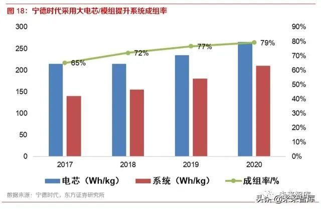以宁德时代电芯变化轨迹为例,2017 年宁德时代电芯规格以标准尺寸为主,成组效率仅有 67%;随后几年里凭借更大的电芯和模组,电池系统的成组率不断提升,2019 年下半年公司推出 CTP (cell to pack)产品,直接省略了模组的保护,其成组效率有望达到 80%。在材料体系没有发生 根本变化的情况下,将系统能量密度提升了 50%。