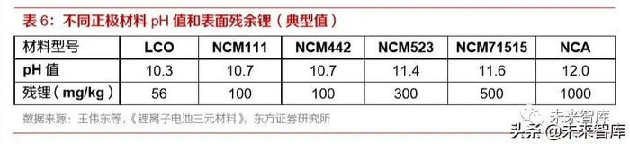 高镍材料表面的碳酸锂和氢氧化锂杂质不易控制,杂质容易超标,这些残留锂化合物主要是 Li2O、LiOH·H2O、Li2CO3等碱性物质,残留物越多,材料表面的 PH 值越大。碱性物质在 空气中容易吸潮,导致材料表面和水反应,或使材料在调浆时黏度变大,或者将多余的水分 带入电池中,造成电池性能下降。调浆黏度变大的原因是黏结剂 PVDF 团聚,使正极浆料黏 度变大难以过筛,情况严重时浆料变果冻状,成为废料。