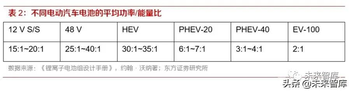 锂电池是有一定差异性的产品,汽车不同的功能需求对于电池的参数有着决定性的影响。粗略来 看,根据使用情况可将锂电池分为两类,一类是功率型,主要用来为汽车加速提供短暂的动力,可 以储存的能量较少,不能长期提供能量,其能量释放时间通常持续几秒到几十分钟;另一类是能量 型,可以长期提供能量,但放电速率相对较小,一般情况下放电时间设计为 1 小时甚至更长,一般 纯电动汽车会用到能量型电池。