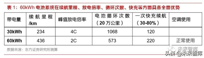 因此,对于电池系统而言,带电量是更具决定意义的参数,质量能量密度的影响相对有限。值得一 提的是,提升带电量还可以缓解诸多困扰电动车的顽疾,以带电量分别为 30kWh 和 60kWh 的两 辆车为例,除了续航里程提升近一倍之外,大容量电池系统还有很多其他优点:首先,大容量电池 系统对于电芯的放电倍率要求降低,整车等速巡航阶段的输出功率约 10kW,但加速阶段输出功率 很大,峰值功率可达 100kW 以上,小系统的瞬时放电倍率要求达到 4C,这对电池寿命造成较大 伤害,而大系统的放电倍率要求仅为大系统的一半;其次,大电池系统的循环次数要求也大为降低, 假设汽车要求行驶里程达到 20 万公里,小系统的循环次数将达到 1100 次,而大系统的循环寿命 要求仅为 570 次,这为更高能量密度、低循环寿命的电池使用开拓了空间;三是充电功率显著提 高,在充电倍率相同的情况下,大系统快充半小时(soc 从 30%充至 80%)即可行驶 220 公里以 上,极大程度上缓解了充电压力,此外,车内空调等其他体验也有明显改善。