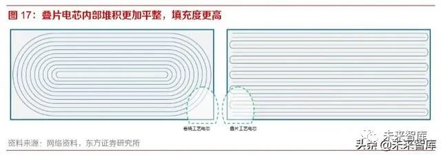 和卷绕工艺相比,叠片工艺具备天然的优势。叠片式极组呈长方形,几乎可以充满方形壳体空间;而卷绕式极组呈椭圆形,必然造成壳体四角的空间浪费。另外,卷绕式极组长时间使用后容易扭曲, 两侧圆弧处断裂造成内部短路。未来方形电池做大做长,电池管理更加简易高效,可以更好地适应 电动汽车模块化生产,这也是圆柱电池所不具备的优势。