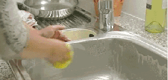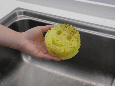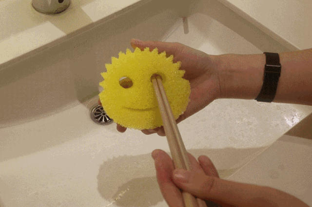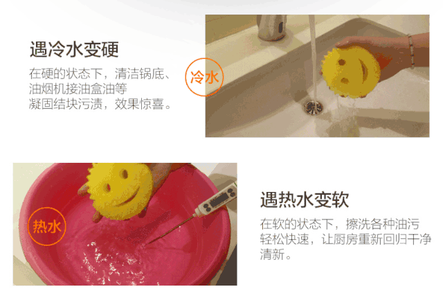 但是它沾了热水之后,又马上变身柔软的海绵,可以刷碗刷盘刷杯子。