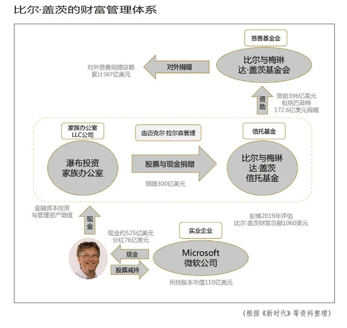从减持微软股票,到将个人的现金收益注入家族信托基金和家族办公室,然而再聘请专业可信的人士负责管理——比尔·盖茨前后用了近30年的筹划与运作,完成了家族财富管理体系的构建:通过三个管理主体,即比尔与梅琳达·盖茨基金会、比尔与梅琳达·盖茨信托基金和瀑布投资,对其家族实业资本、金融资本和社会资本实现了全面、系统的管理和覆盖。优化了家族财富的结构,降低了对单一企业的风险敞口,确保了家族财富持久的保值增值。