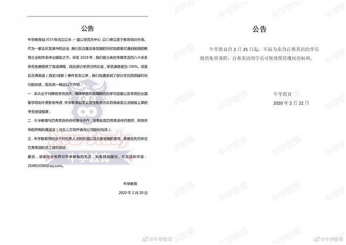 2月22日牛学教育再发公告,表示自2月25日起,不再为来自百弗英语的学生提供免费课程,其学员可以保留继续维权的权利。此外牛学教育并未多作解释。