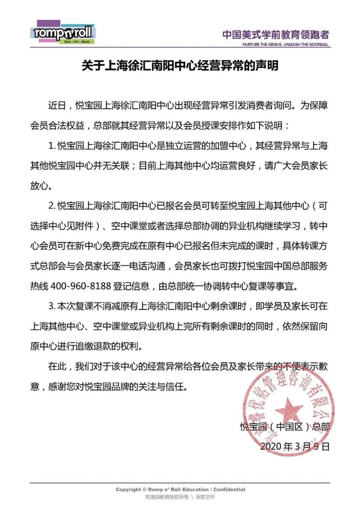悦宝园(中国区)总部在3月9日发表声明,称悦宝园上海徐汇南阳中心属独立运营的加盟中心,其运营与其他中心无关,其他中心仍正常运营。但在南阳中心报名的会员可免费转至当地其他中心,并保留对原中心追缴退款的权力。