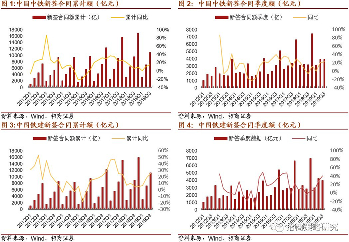 1)中国中铁:前3Q累计新签订单总额 10896.80 亿元,同比增长14.5%,其中第三季度新签订单为3883.40亿元,相比第二季度涨幅22.7%,与同期相比增加了0.07%。除此之外,铁路工程新签订单累计额达1490.00 亿元,同比增加11.0%,其中第三季度铁路工程新签订单为481.40亿元,与第一季度相比下降2.0%。2)中国铁建:前3Q累计新签订单总额 11152.34 亿元,同比增长25.1%,其中第三季度新签订单为3965.37亿元,相比第二季度下降5.9%,与同期相比增加了40.3%。除此之外,铁路工程新签订单累计额达1471.62 亿元,同比增加14.78%,其中第三季度铁路工程新签订单为490.59亿元,与第二季度相比下降了23%,同比增长7.9%。3)中国通号:前3Q累计新签订单总额 475.1亿元,同比增长6.3%,其中第三季度新签订单为134.90亿元,相比第二季度下降49.2%,与同期相比增加了8.9%。除此之外,铁路工程新签订单累计额达211.90 亿元,同比增加23.9%,其中第三季度铁路工程新签订单为47.3亿元,同比增加6.3%。