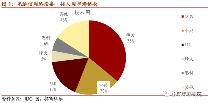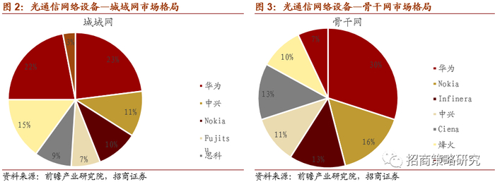2019年光通信网络设备领域华为、中兴通讯、烽火、思科等企业占据核心地位。细分领域来看,在全球接入网市场华为市场份额最高达36%,其次占比较高的还有中兴通讯市场份额为20%,ALU市场份额为17%、烽火市场份额为5%,思科市场份额6%。在城域网领域华为占据23%的市场份额,全球领先;其次中兴通讯全球市场份额11%,占比相对较高的还有Nokia10%,Fujitsu7%,思科9%,Ciena15%,烽火3%。在骨干网领域,华为依然占据最高的市场份额,占比达30%;其次Nokia占比16%,Infinera占比13%,占比相对较高的还有中兴通讯、Ciena、烽火,占比分别为11%,13%,10%。