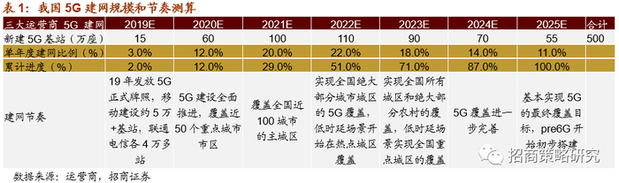 预计2021-2023年或为我国5G建设高峰期,根据招商通信组,5G的宏基站总数约495万座,取整预计为500万座。参考4G的建网节奏,预计三大运营商对5G的建网进度如下表所示。