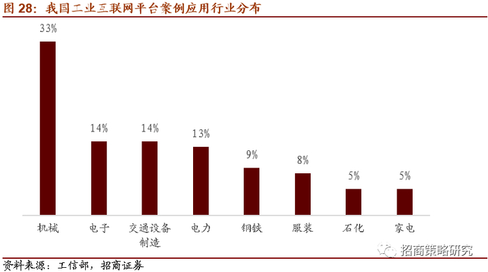 从格局或者建设路径上来看,在基础架构选型方面:基础架类型方面,59%的平台企业选择自主研发,其余35%的使用Cloud Foundry,6%使用Open Shift这些成熟的架构体系。在我国工业互联网平台案例应用行业分布中,机械行业占比最高,为33%,其余依次是电子、交通设备制造、电力、钢铁、服装、石化,而家电占比最低,仅为5%。