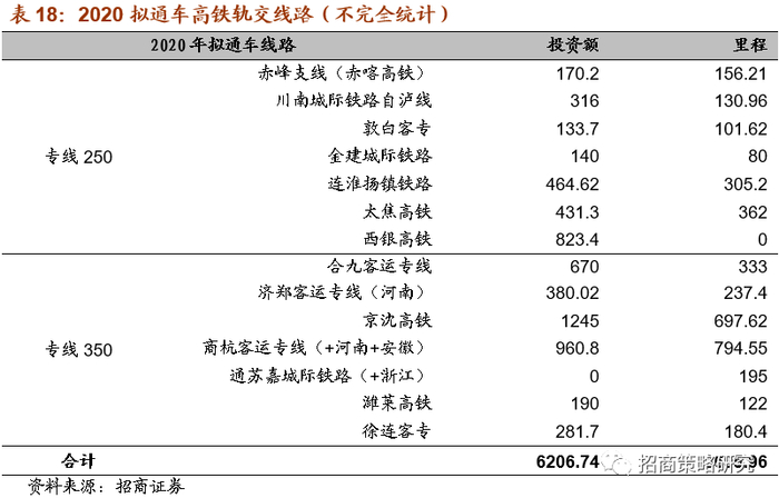 在经济下行压力加大的背景下,高铁轨交投资规模的加大将成为托底经济的有力手段之一。根据对线路的统计预测,2020年拟通车线路共14条,其中专线250和专线350各7条,通车有望为3696公里,对应投资规模为6207亿元。