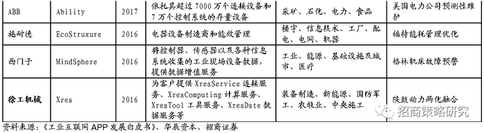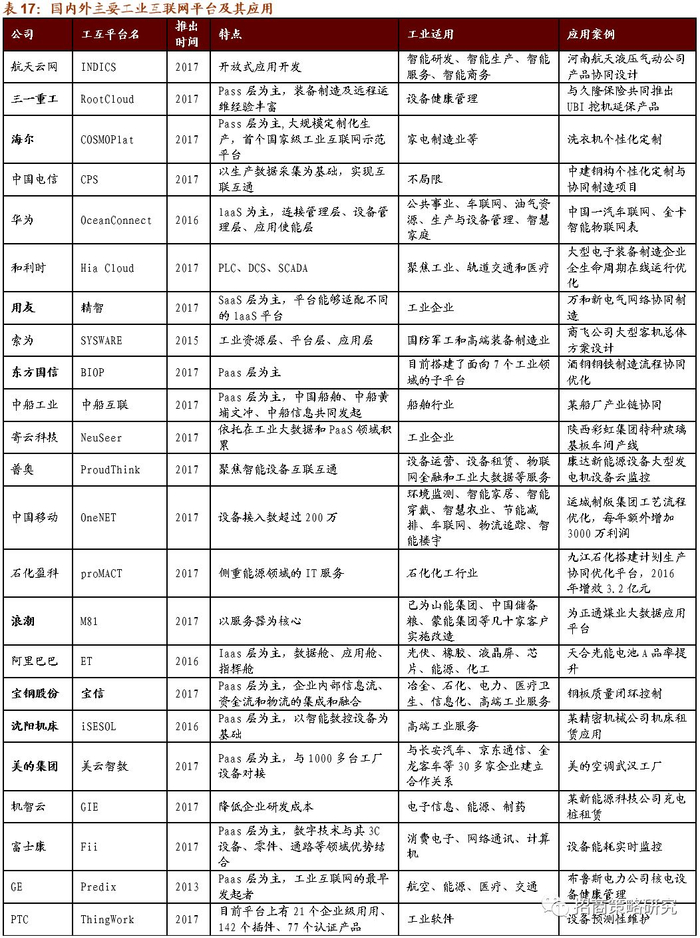 《工业互联网APP发展白皮书》显示,2016年、2017年国内外主要工业互联网平台推出较多。2013年GE推出Predix成为工业互联网最早的发起者,平台以Paas为主,主要以应用在航空、能源、医疗、交通领域,典型案例有布鲁斯电力公司核电设备健康管理。2015年索为推出主要适用于国防军工和高端装备制造业的SYSWARE;2016年华为推出了OceanConnect,以IaaS层为主,连接管理层、设备管理层、应用使能层,主要应用在公共事业、车联网、油气资源、生产与设备管理、智慧家庭领域。同年,阿里巴巴推出ET、沈阳机床推出iSESOL、西门子推出MindSphere、徐工机械推出Xrea。2017年更多的工业互联网平台陆续推出。航天云网推出以开放式应用开发为特点的INDICS、三一重工推出RootCloud、海尔推出试用在家电制造领域的COSMOPlat,此外还有中国电信的CPS、和利时的Hia Cloud、用友的精智等。