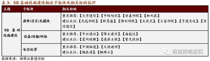 总结而言,5G基础设施投资规模大约为2-2.5万亿之间,将给上下游产业链带来直接拉动,5G基建将是5G产业发展的排头兵,在经济下行压力的背景下,5G建设节奏将加速。投资建议方面,根据招商证券通信团队的推荐,可以关注下表相关标的: