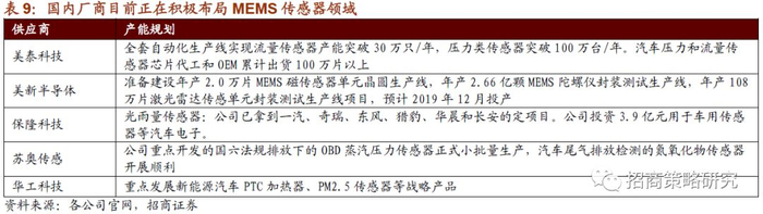 国内厂商目前正在积极布局MEMS传感器领域。从各公司官网公布的资料来看,美泰科技全套自动化生产线实现流量传感器产能突破30万只/年,压力类传感器突破100万台/年。汽车压力和流量传感器芯片代工和OEM累计出货100万片以上;美新半导体准备建设年产2.0万片MEMS磁传感器单元晶圆生产线,年产2.66亿颗MEMS陀螺仪封装测试生产线,年产108万片激光雷达传感单元封装测试生产线项目;保隆科技投资3.9亿元用于车用传感器等汽车电子;苏奥传感重点开发的国六法规排放下的OBD蒸汽压力传感器正式小批量生产;华工科技重点发展新能源汽车PTC加热器、PM2.5传感器等战略产品。